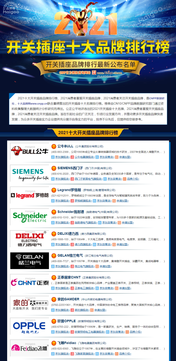 “2021年开关插座十大品牌”评选,实行公开透明的原则,名单由热门网站十大品牌网公布,可进行查询、印证。
