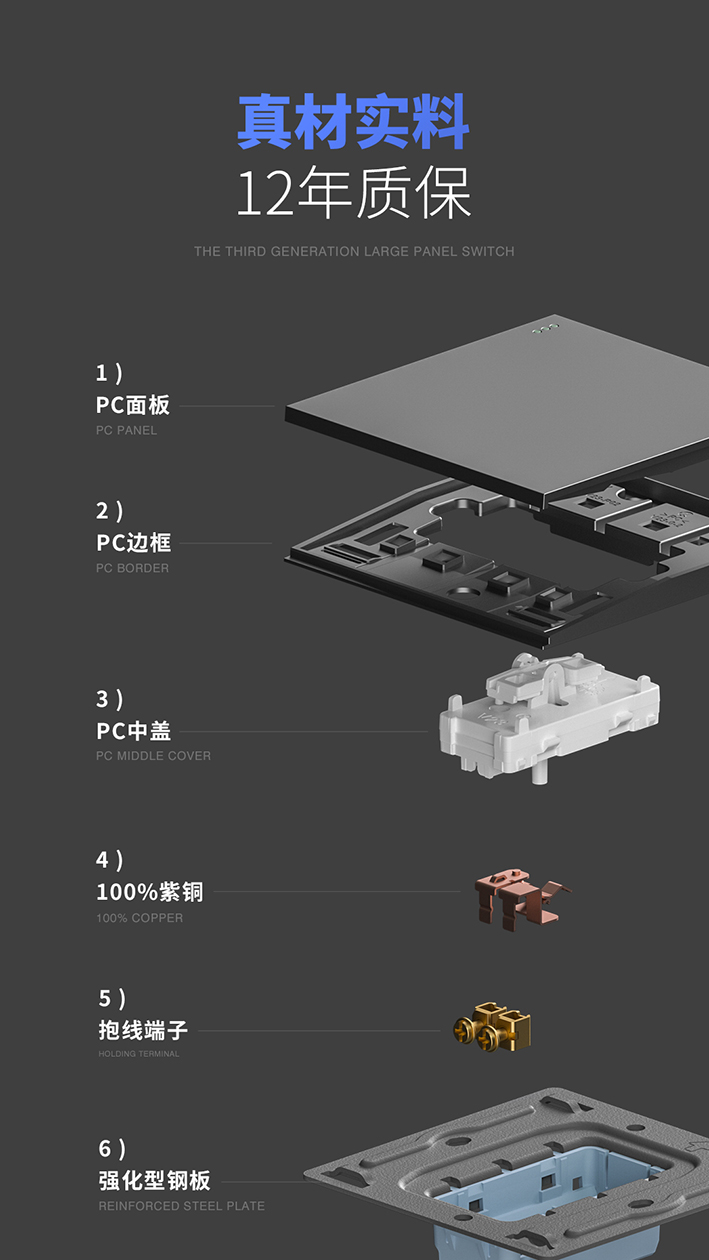 选材方面。PC面板、PC中盖、PC边框、强化型钢板等,真材实料,12年质保。过硬的品质,满足高端市场需求。