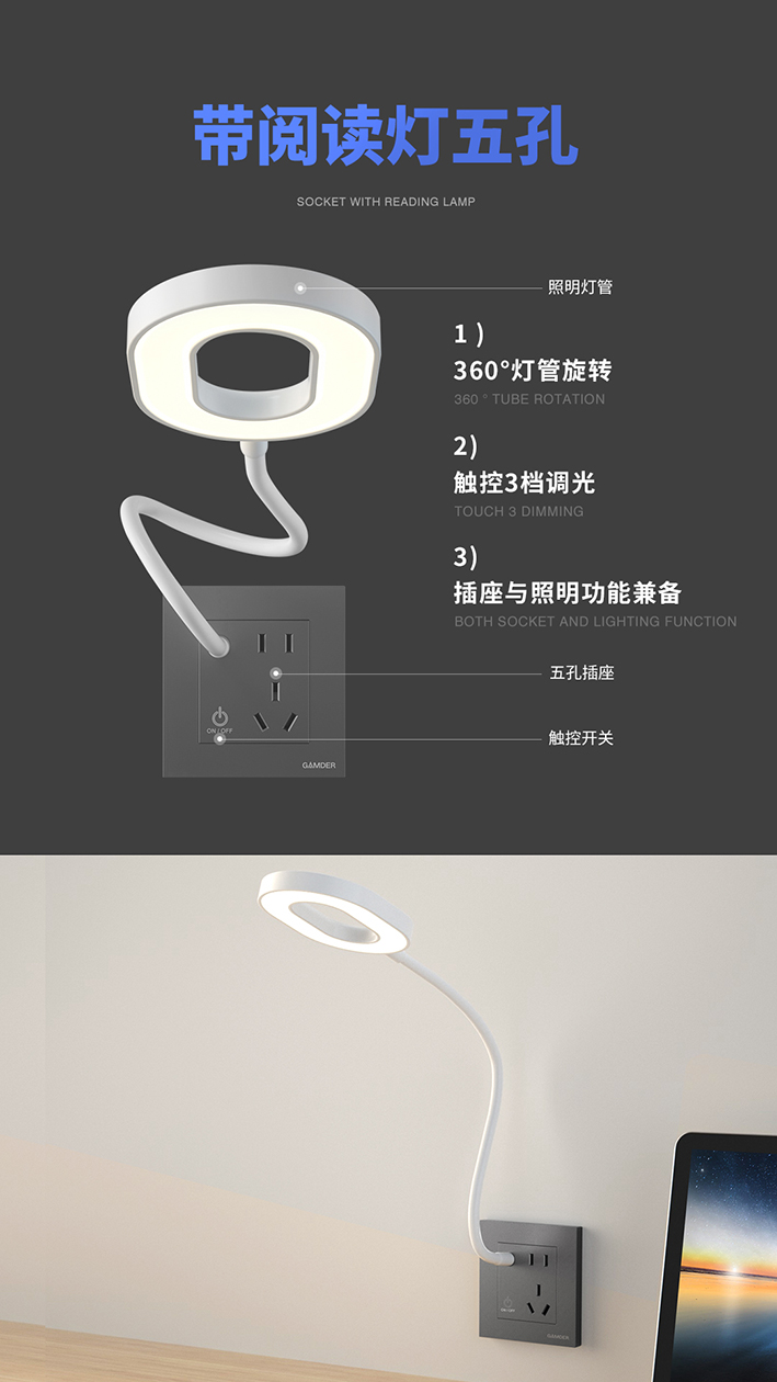 功能方面。V20系列五孔,功能得到提升。阅读灯五孔、感应灯五孔、小夜灯五孔,实现照明与插座巧妙结合,十分人性化,给人们的生活带来许多便利。