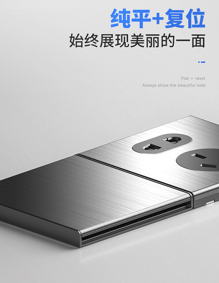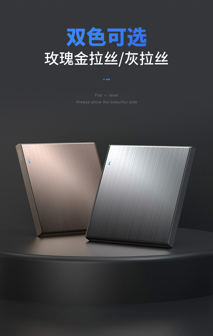 外观方面。V26系列分有两种颜色,玫瑰金拉丝和灰拉丝,可任意选择。V26系列,属于第三代纯平复位大板开关。