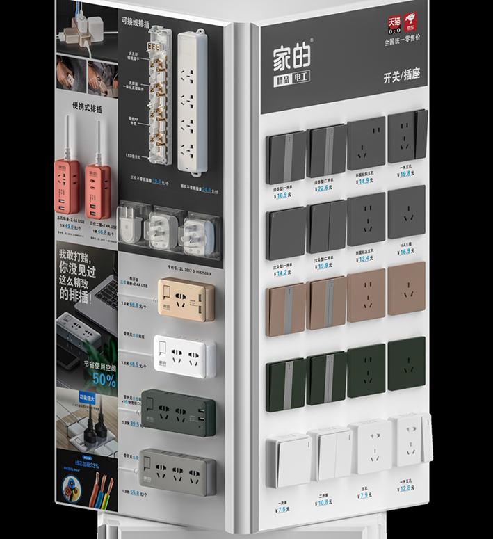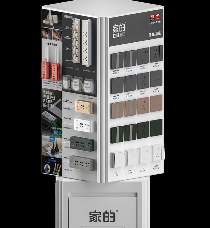 魔方转柜的创新产品和独特体验能为客户创造新价值!家的品牌一直致力于电工产品的研发创新,比如:新功能五孔,是家的专利产品,帮助用户解决生活中很多场景痛点,为门店带来“人无我有”“人有我优”的新价值。动感旋转展示设计,体验直观新颖,每一个产品,用户都能近距离触摸体验,在旋转交互中提升用户的参与感和体验感。