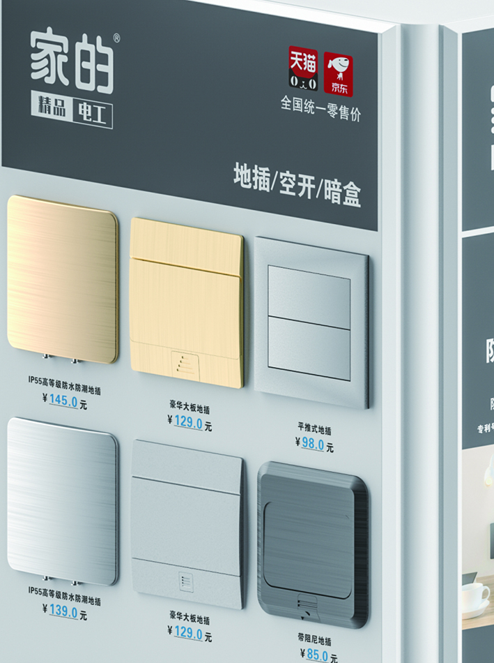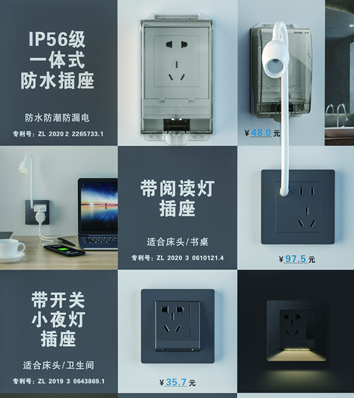 家的精品五金项目,包含的特色产品有:大面板开关、新国标斜五孔、带开关五孔、阅读灯五孔、便携式旅行排插、第四代精品排插、可拆插头、地插、高分断小型断路器、贯通式专利暗盒等。