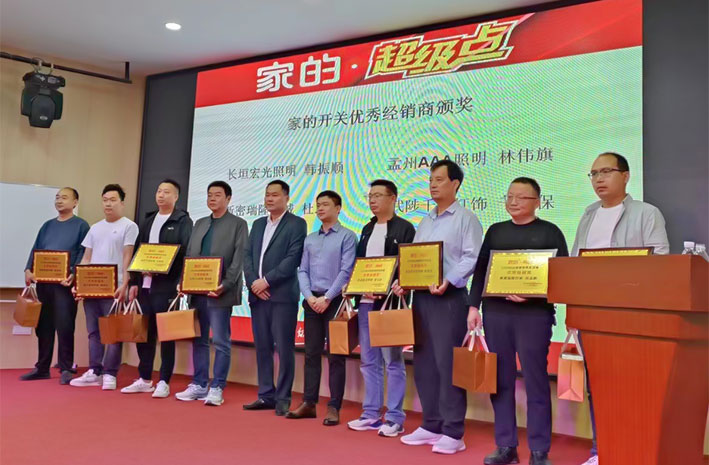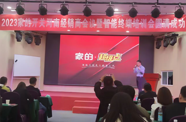 接下来,家的中西部销售总监李晓耀发表讲话。他从中山市家的电器有限公司的发展历史,研发、生产、检测的实力,以及家的开关品牌的知名度、影响力等进行了全方位的讲解。他重点讲解家的公司现阶段主推的核心差异化品类——超级点。他分析超级点开关的竞争优势和卖点等。特别是近期的新品——V20肤感白超级点受市场热捧,供不应求,见证了超级点市场竞争力强的优势。他还介绍了家的魔方旋转柜、智能灯箱等独特的终端展示方式。他的讲话内容,增强了经销商销售家的产品的信心!
