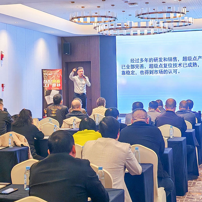 接着,他通过图片、视频,在现场详细地给客户介绍了“超级点”家族全系产品的各大特点。然后,他重点讲解了V12系列以旧换新工厂直补的活动政策,客户反馈非常热烈。